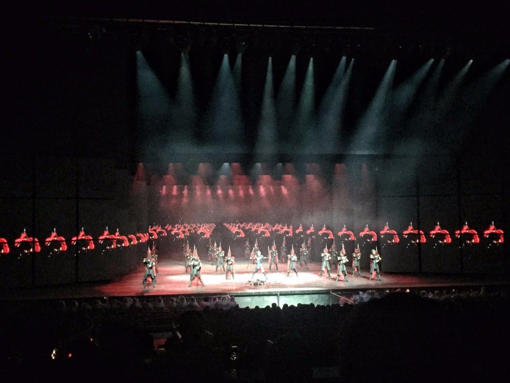 The big show is on a big stage, in a partly open air theater with hundreds of raked seats. The fixed stage is deep and wide – suffice it to say that it accommodates horses, and more than one at a time. The close-in rows of seats are on a turntable, and retract to uncover a water feature, really pretty necessary in south China.
