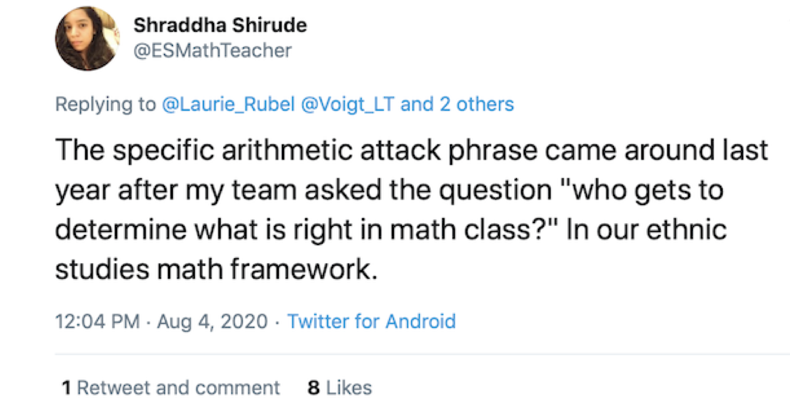 Among the twitter combatants on whether 2 + 2 = 4 is a real mathematics teacher – an ethnic studies math teacher – who posted –
