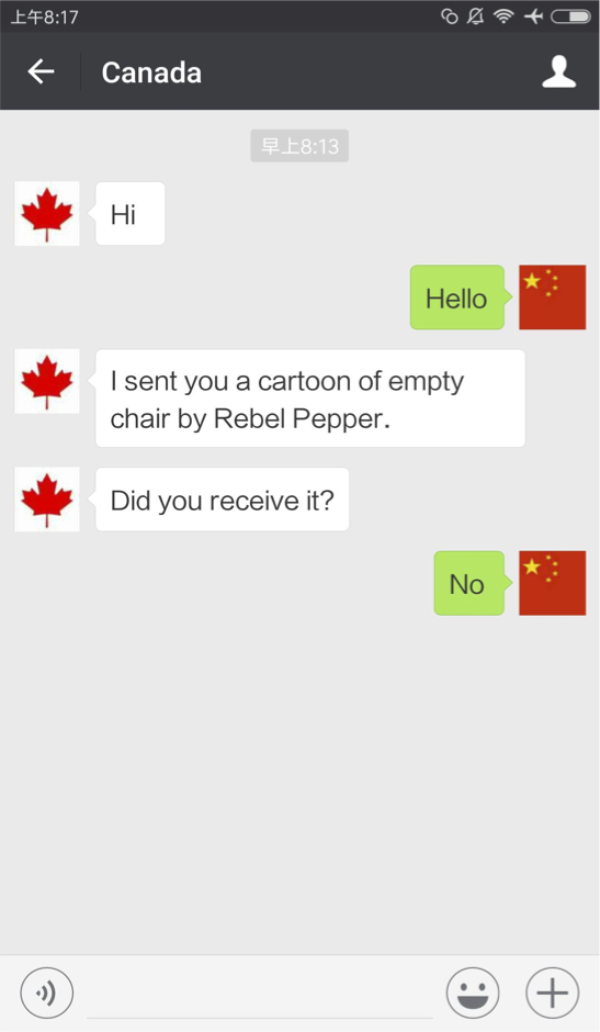 Figure 1: Top, a Canadian account sending an image memorializing Liu Xiaobo over 1-to-1 chat; bottom, the Chinese account does not receive it.