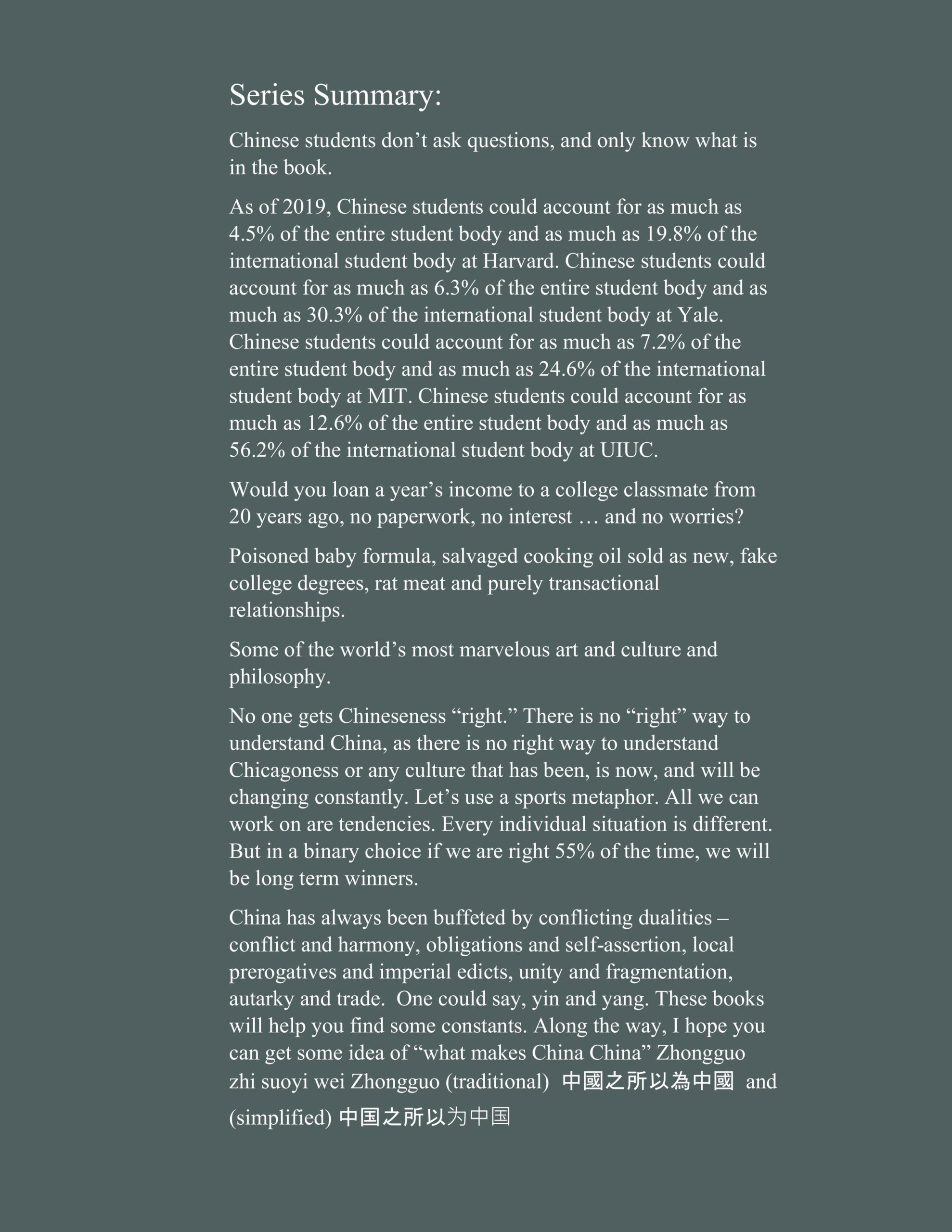 This book is in three parts. Book 2a (Chapters 1 through 6) is background on American cultural divisions and describes how a virtue ethic like Confucianism can assist in American culture wars. Book 2b (Chapters 7, 8 and 9) answers objections to Confucianism as moral guidance and provides comparisons with Christianity. Book 2c contains Appendices and more detailed answers – golden rule, spirituality, teleology and sacred texts.