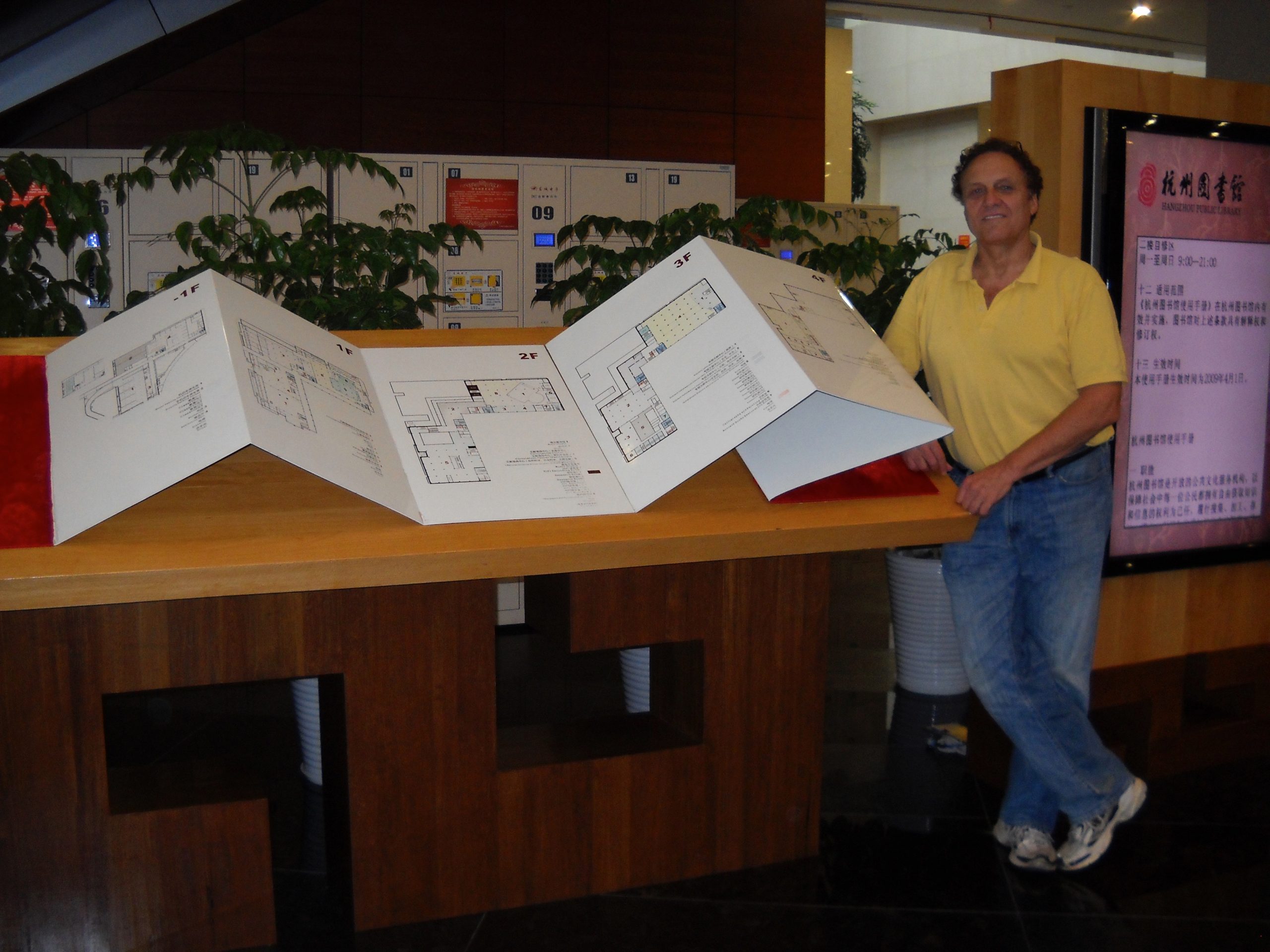 The library floor guide is pretty cool, arranged like a book table of contents. It is six metal pages, unfolded like a tour guide brochure, with the inner five leaves making two tents with the wood base on which it sits, with descriptions of floors and book and material locations, in English … and Chinese.